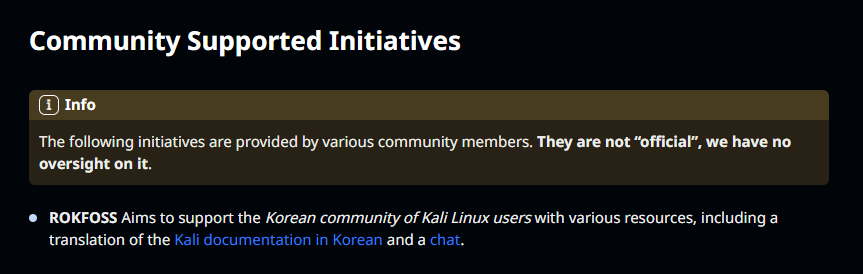 이는 칼리 리눅스 공식 홈페이지에 등록된 유일한 한국어 커뮤니티이자, 외부 커뮤니티이기도 하다. 다만 외부 커뮤니티이기 때문에 기술지원이나 버그 제보와 같은 것들은 반드시 칼리팀이 운영하는 공식 사이트에서 진행하는 것이 좋다.